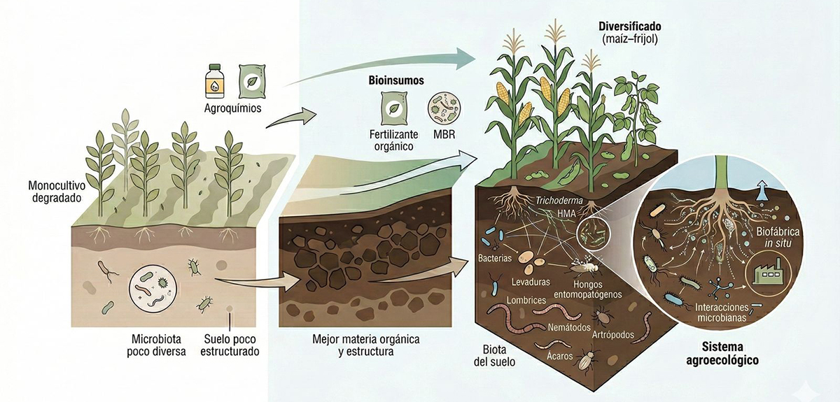 Los sistemas agrícolas en México y en el resto del mundo están en proceso de transición agroecológica, buscando diseñar sistemas de cultivos con menos impactos ambientales, minimizando el uso de agroquímicos. En el primer paso, con sustitución por bioinsumos como fertilizantes orgánicos y microorganismos rizosféricos benéficos (MBR). En este contexto, es importante considerar la posibilidad de conservar y manejar los MBR nativos asociados a los cultivos de manera natural. En primera instancia, se requiere conocimiento básico de la abundancia, diversidad y funciones de los MBR. También es relevante saber cómo los MBR interactúan entre ellos y con la biota del suelo en general. Aadicionalmente, se requiere saber cómo las prácticas agrícolas influyen en el desempeño de los MBR. En este seminario se presentarán resultados de proyectos de investigación y colaboración con el sector productivo y gubernamental, útiles para el aprovechamiento de la rizosfera como biofábrica in situ de MBR y motor biológico para la transición agroecológica.