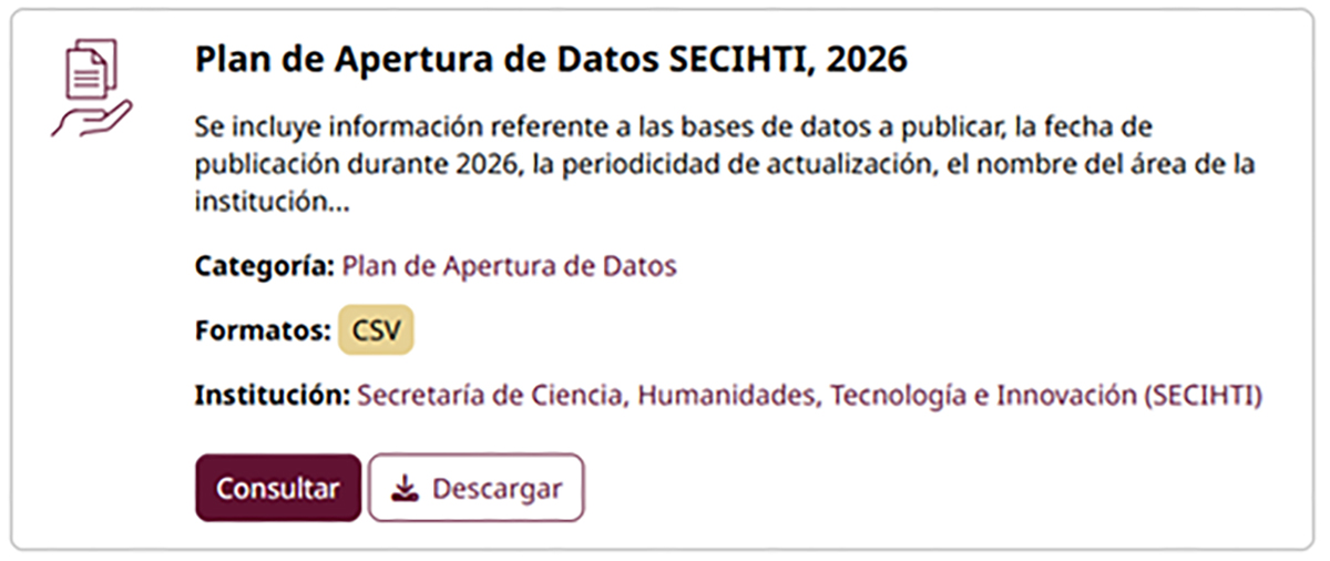 Fig 3. Visualización de los metadatos del Plan de Apertura de Datos de SECIHTI. Fuente: Plataforma datos.gob.mx