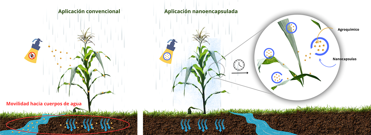 Izquierda: la aplicación convencional provoca la movilidad de los agroquímicos hacia cuerpos de agua. Derecha: las nanocapsulas liberan el compuesto de manera controlada evitando su movilidad.