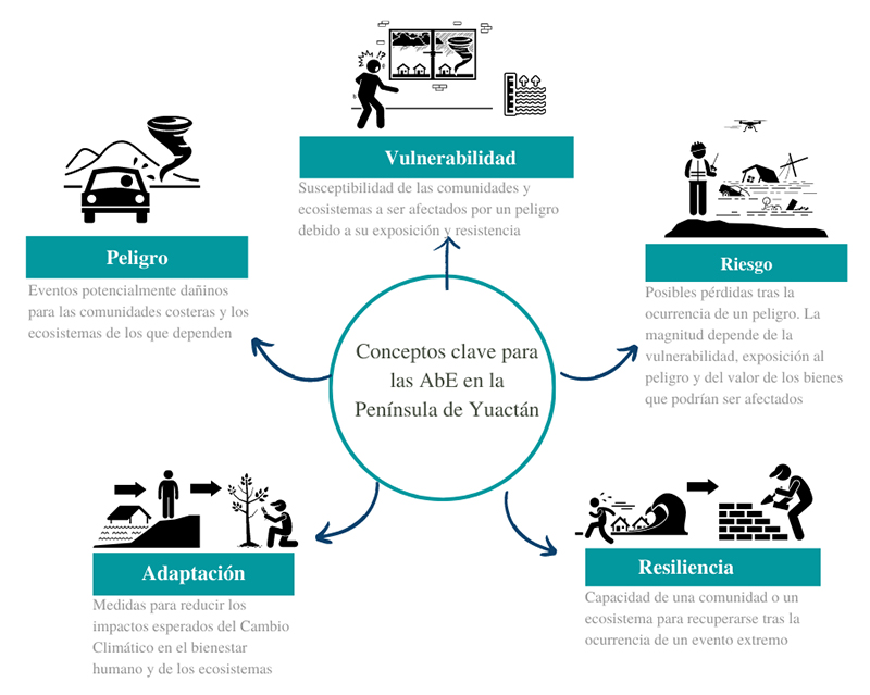 El diseño e implementación de medidas de Adaptación basadas en Ecosistemas (AbE) depende de la integración de conceptos clave como el peligro, el riesgo, la adaptación y la resiliencia tanto de las poblaciones costeras como de los ecosistemas de los que dependen. Créditos: Elaboración propia