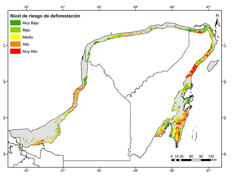 Índice de Riesgo de Deforestación (IRDef) de la vegetación de la franja costera de la Península de Yucatán. Créditos: Elaboración propia con información del IRDef de INECC.
