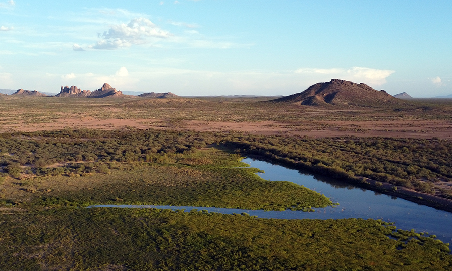 Fotografía aérea del Presón El General, un humedal temporal que reverdece durante las lluvias en la Reserva de la Biósfera de Mapimí que alberga una población Casquitos (Kinosternon durangoense). Foto: Jorge Ramos-Luna.