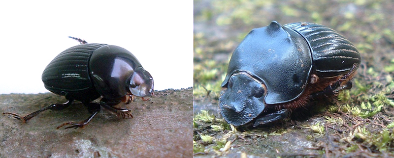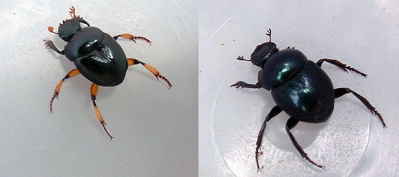 Especies de escarabajos dominantes de los fragmentos de la selva de Los Tuxtlas, Canthidium centrale (izquierda) y Dichotomius satanas (derecha)