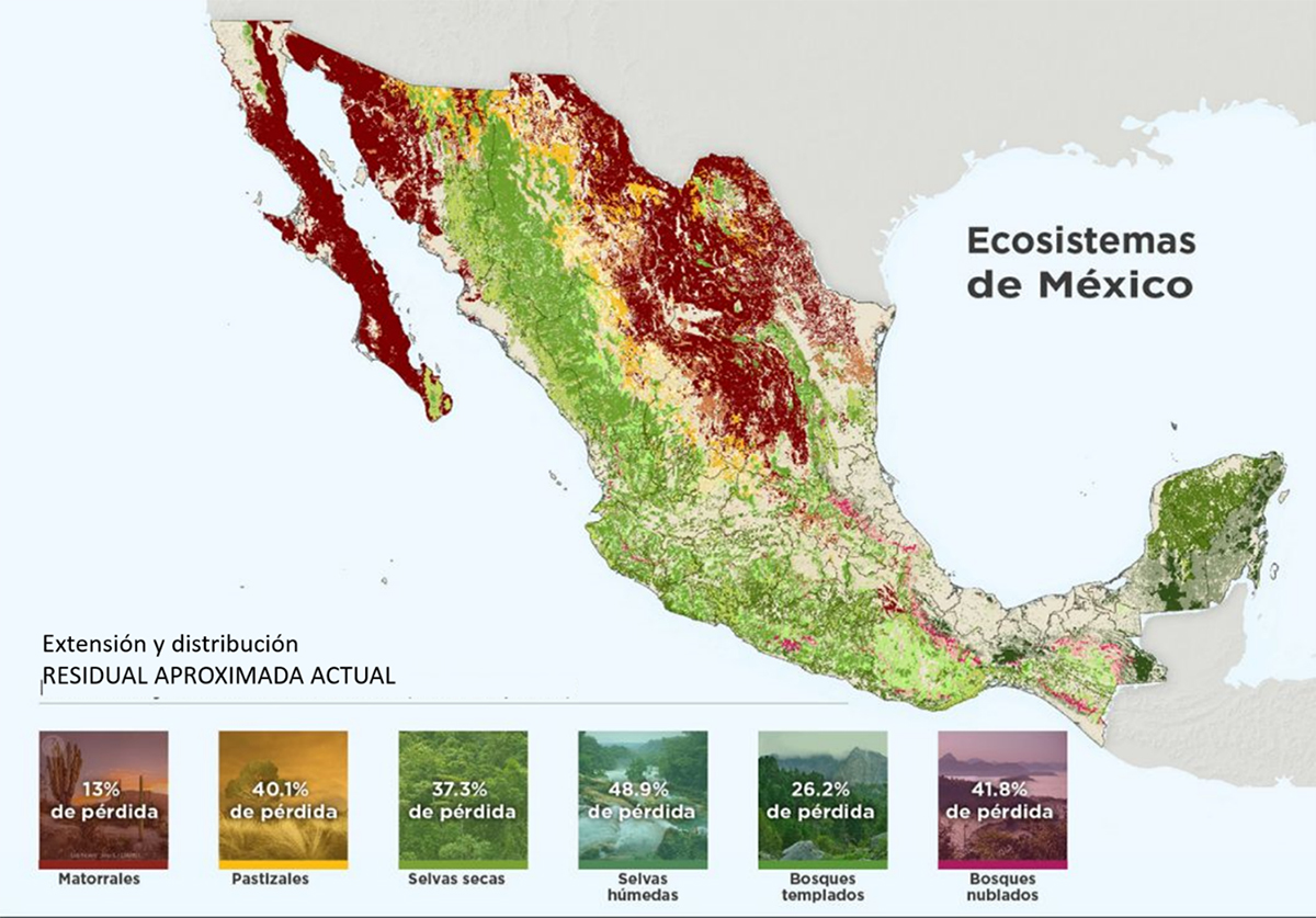 Fuente: Comisión Nacional para el Conocimiento y Uso de la Biodiversidad (CONABIO) e Instituto Nacional de Estadística y Geografía (INEGI), 2014. Extensión y distribución residual aproximada de ecosistemas en México, incluyendo formaciones forestales.