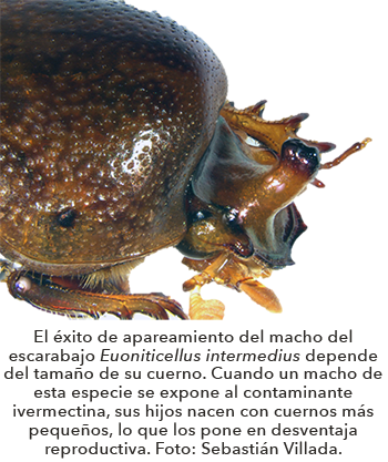 Las condiciones estresantes durante el desarrollo pueden deberse a la exposición de los individuos a contaminantes ambientales, y puede haber repercusiones sobre la siguiente generación, aunque esta generación no se exponga a la condición desfavorable. Por ejemplo, en el escarabajo del estiércol, Euoniticellus intermedius, un equipo de investigación del INECOL descubrió que machos que se han alimentado de estiércol que contiene ivermectina (un desparasitante potente que es frecuentemente utilizado en el ganado) producen hijos con cuernos más pequeños que machos que nunca han sido expuestos a esta droga. El cuerno de los escarabajos del estiércol es utilizado en peleas entre machos, cuando hay disputas por acceso a hembras, a alimentos, y/o a recursos para reproducción. Machos con cuernos más grandes generalmente tienen mayor probabilidad de ganar estas disputas, y por lo tanto de reproducirse. Por lo tanto, haber tenido un padre que estuvo expuesto a ivermectina puede reducir el éxito reproductivo de un macho – aunque este macho jamás se exponga directamente a ivermectina.