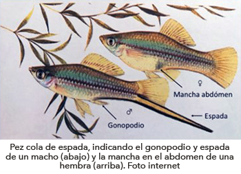 El género de peces Xiphophorus se encuentra dentro de esta familia y a varias especies se les conoce comúnmente como peces cola de espada. El nombre común de estos peces se debe a que los machos sexualmente maduros tienen una espada, que es una elongación de la parte ventral de su aleta caudal o cola (Fig. 1). Las hembras sexualmente maduras tienen una mancha negra en su abdomen que rodea los órganos reproductores y no tienen espada (Fig. 1). Los peces cola de espada están divididos en dos grupos, el del norte, formado por nueve especies de peces nativos de México, que se distribuyen al norte del Río Nautla, en diferentes afluentes del Río Pánuco, en los estados de Tamaulipas, San Luis Potosí e Hidalgo. El grupo del sur está formado por ocho especies que se distribuyen al sur del Río Nautla, en ríos del estado de Veracruz, así como en Belice, el norte de Guatemala y de Honduras (Fig. 2).