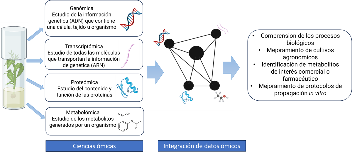 Los órganos y tejidos vegetales están compuestos por diferentes tipos de células, cada una con funciones específicas, dirigidas por distintos programas de genes, proteínas y metabolitos. La actividad de cada tipo de célula determina las características de los tejidos y órganos vegetales, pero su función requiere de una cuidadosa coordinación de cada uno de los programas antes mencionados. Por lo que, las ciencias “ómicas” se han aplicado para comprender los mecanismos que regulan el complejo desarrollo de las plantas. La integración de los múltiples enfoques ómicos no solo puede ayudar a esclarecer cuales son los factores clave que permiten el desarrollo de la planta bajo condiciones in vitro, sino que además permite generar estrategias para resolver las limitaciones e incluso mejorar el proceso. Las ciencias ómicas están ayudando a entender las limitaciones como en el caso de la propagación in vitro del aguacate, que presenta bajas tasas de germinación y malformación en el desarrollo de las plantas; con estudios proteómicos y metabolómicos preliminares hoy sabemos que hay proteínas y metabolitos que no están presentes en las plantas cultivadas in vitro, lo que evita su correcto desarrollo. Otro ejemplo es la aplicación de la metabolómica en la industria farmacéutica, ésta ha ayudado a la identificación de metabolitos provenientes de plantas, entre los más conocidos están el ácido ascórbico (vitamina C) de los cítricos, el salicilato (de la corteza de sauce) para tratar la fiebre y el paclitaxel (de la corteza del tejo) para el tratamiento del cáncer.