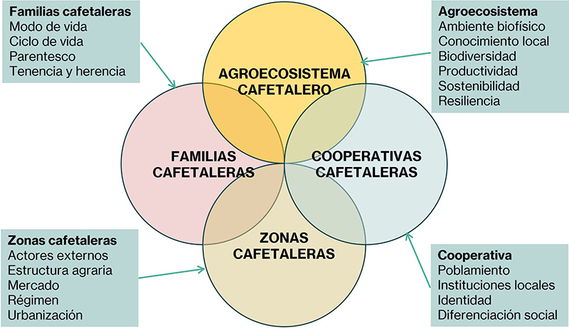 Para cumplir con el objetivo, se realizaron dos talleres con familias cafetaleras quienes han reconocido el trabajo cooperativo dentro del enramado socioecológico y contextual indicado en la Figura 1, así mismo, se han generado espacios de reflexión acerca de los sentidos que tiene la formación de cuadros para las organizaciones cafetaleras y los desafíos que ello implica.