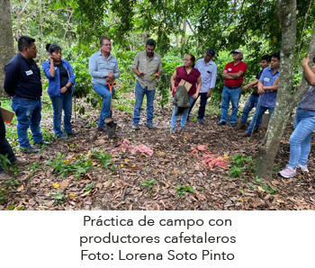 enfermedades, edad de las plantas, sombra); Prácticas de manejo (conservación de suelo y agua, prácticas de nutrición vegetal, prácticas culturales, control de plagas y enfermedades, renovación de plantas); Estrategias pedagógicas (formas de intercambio de saberes, relevo generacional, dispositivos didácticos, monitoreo y evaluación técnica.