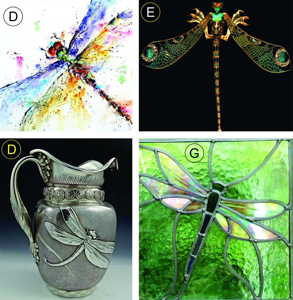 D. Libélula en pintura expresionista -- Composición vibrante con colores contrastantes y pinceladas sueltas para reflejar energía y libertad (tomada de: https://n9.cl/4nn6n). E. Mujer-flor de René Lalique, Museu Calouste Gulbenkian - Pieza donde la figura femenina se fusiona con elementos naturales, mostrando la maestría del Art Nouveau (tomada de: https://n9.cl/jqekln). F. Jarra de metal con relieve de libélula - Diseño ornamental donde la libélula aporta equilibrio y armonía dentro de la decoración clásica (tomada de: https://n9.cl/x86fk). G. Vitral de libélula - Composición en vidrio que juega con la luz, resaltando los detalles y la simbología de la libélula (tomada de: https://n9.cl/rl5o6).