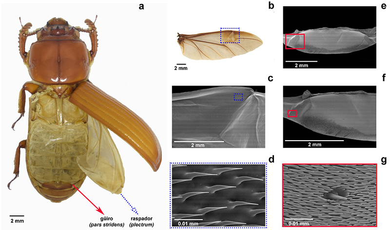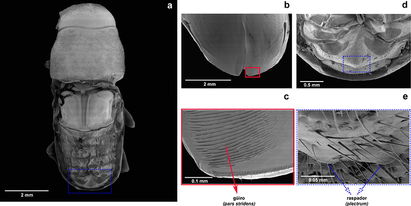 Los escarabajos de la madera se caracterizan por formar grupos familiares donde los padres cuidan de sus crías (larvas) y todas las especies poseen un raspador y un güiro tanto en adultos como en larvas. Los adultos emiten sonido al frotar una región de las alas (plectrum, Fig. 1 b-d) con respecto al dorso de su abdomen (pars stridens, Fig. 1 e-g), mientras que las larvas lo emiten al mover su último par de patas (plectrum) con respecto a la base del par medio de patas (pars stridens) (Fig. 2). Aunque la ubicación de ambas estructuras es constante, la forma y densidad de estructuras que emiten sonido cambia entre especies (3,4). Dicha variación sugiere que el raspador y el güiro son importantes para que los individuos reconozcan a su especie y mantengan sus grupos familiares. Por otro lado, en los escarabajos descortezadores no todas las especies poseen estructuras estriduladoras, pero sí algunos grupos de especies relacionadas (géneros). La ubicación del raspador y del güiro cambian entre géneros e incluso entre machos y hembras, tal es el caso de los géneros Ips, Dendroctonus y Tomicus. En el caso de Dendroctonus y Tomicus, sólo los machos estridulan y lo hacen frotando el dorso del abdomen (plectrum, Fig 3 d-e) contra la superficie interna de los élitros (alas modificadas en forma de estuche) que fungen como pars stridens (Fig. 3 b-c) (5). Mientras que en Ips, sólo las hembras estridulan y lo hacen frotando el borde del pronoto (estructura posterior a la cabeza) que funge como plectrum (estructura posterior a la cabeza) con el dorso de la cabeza (pars stridens) (6). En los tres géneros la densidad de ranuras del güiro (pars stridens) permiten diferenciar entre especies (7-9).