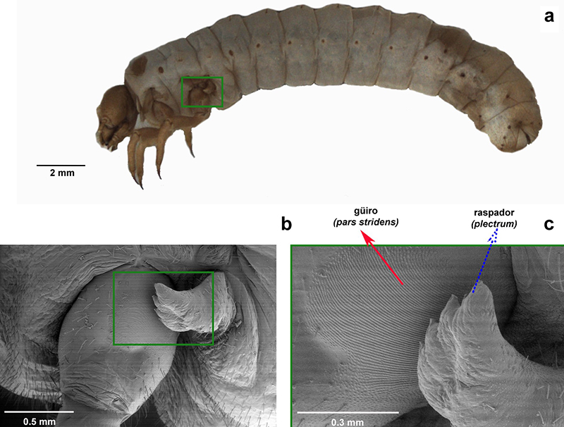 Larva de escarabajo de la madera Heliscus tropicus (Passalidae) y sus estructuras estriduladoras. a) Fotografía lateral de la larva. b-c) micrografías a diferentes acercamientos del raspador (plectrum) y güiro (pars stridens). Líneas azules punteadas hacen referencia al plectrum. Líneas rojas hacen referencia al pars stridens.(Créditos: Edwin R. Ariza-Marín y Greta H. Rosas-Saito).