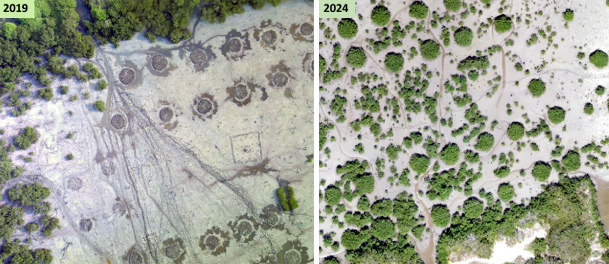 Fig 1: Comparativa del año inicial de las acciones en 2019 con el año actual de 2024 de la efectividad de las acciones de restauración del mangler. Fotografía tomada por: Ángel Francisco Zaragoza Méndez