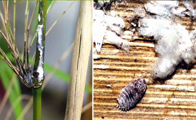 Lepidóptero (palomilla) de hábitos nocturnos. Cuyos daños suelen ser muy severos si no se controlan a tiempo: Los adultos son de color café claro-negruzco, miden aproximadamente 2 cm de longitud, la hembra deposita sus huevecillos en diferentes partes de la superficie del tallo o culmo. Al nacer las larvas se introducen en los culmos mediante fuertes mandíbulas con las que se alimentan del tejido leñoso (Figura 4).