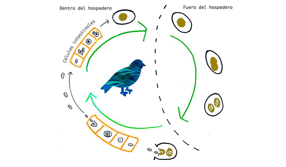 Fig 2. Esquema general del ciclo de vida de las Isosporas. Figura adaptada de Knight et al. (2018). Las Isosporas parasitan las células intestinales de las aves. Su crecimiento y reproducción sucede dentro del hospedero y luego son excretadas en las heces al medio ambiente, donde son consumidas por otra ave y ésta se infecta.
