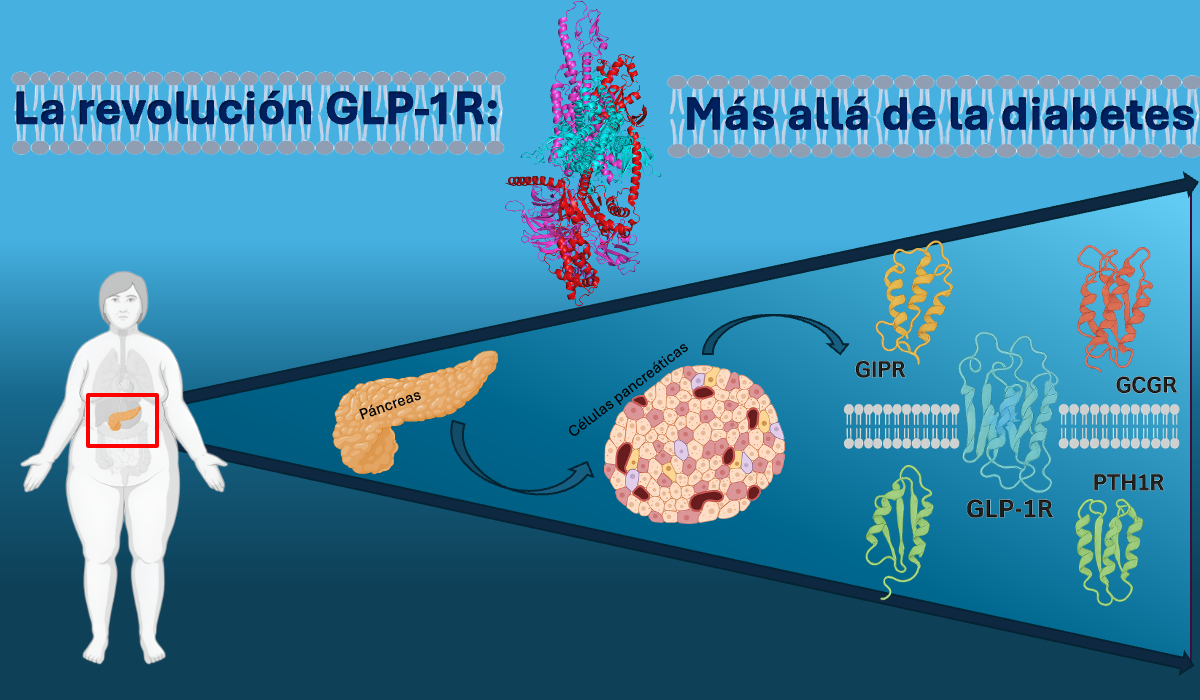 Primero hay que aclarar que el GLP-1 (glucagon-like peptide-1) es una hormona intestinal que estimula la secreción de otra hormona muy importante, la insulina, mediante la unión a su receptor GLP-1R. Posteriormente la insulina inhibe la liberación de glucagón y ralentiza el vaciado gástrico, lo que contribuye a una sensación de saciedad prolongada. Estos efectos combinados han generado un “boom” terapéutico, ya que GLP-1 se ha convertido en una herramienta tanto para el control de la glucemia como para la pérdida de peso. También cabe mencionar que esta hormona se une a proteínas específicas que están en la membrana celular y se denominan receptores acoplados a proteínas G (GPCRs, por sus siglas en inglés); estos receptores cumplen con múltiples funciones celulares cuando sus hormonas ligantes se acoplan. Por ejemplo: