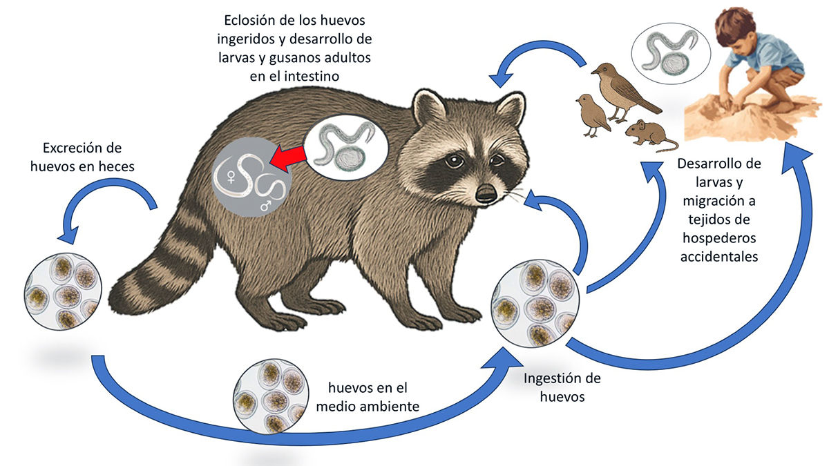 En los humanos, este viaje comienza una vez que las larvas eclosionan de los huevos dentro del tracto gastrointestinal, y de ahí rápidamente penetran la mucosa intestinal y migran por la sangre hacia el hígado, los pulmones u otros tejidos sin saber que están perdidos y que no encontrarán el camino a casa. La consecuencia de este andar errante, además de la muerte del parásito, suelen ser distintos padecimientos asociados al lugar del cuerpo donde alcancen a llegar. Entre estos padecimientos están la larva migrans visceral que afecta hígado, pulmones o corazón, larva migrans ocular cuando llega al ojo o larva migrans neuronal cuando alcanza a llegar al cerebro. Lamentablemente, estos padecimientos pueden resultar en enfermedades fatales o trastornos neurológicos con consecuencias graves. La buena noticia es que a pesar de que este parásito se ha reportado en mapaches en México, Estados Unidos, Costa Rica, Europa y Asia, no todos los mapaches están infectados y los casos suelen ser muy esporádicos en los humanos alrededor del mundo, contando con poco más de 40 casos reportados históricamente. Entonces he aquí la historia de una enfermedad que es el reflejo de un viaje de un parásito perdido en un hospedero equivocado y que intenta encontrar un nuevo lugar donde poder establecerse, crecer y reproducirse. Pero otra buena noticia es que existen formas de ayudar a este parásito a que no se pierda y se mantenga entre las poblaciones de mapaches, evitando que llegue a nosotros y afecte nuestra salud. Entre estas medidas preventivas se resalta primordialmente el evitar el contacto con heces de mapache, no tener mapaches como mascotas y procurar una higiene adecuada, sobre todo en áreas donde hay mapaches silvestres.