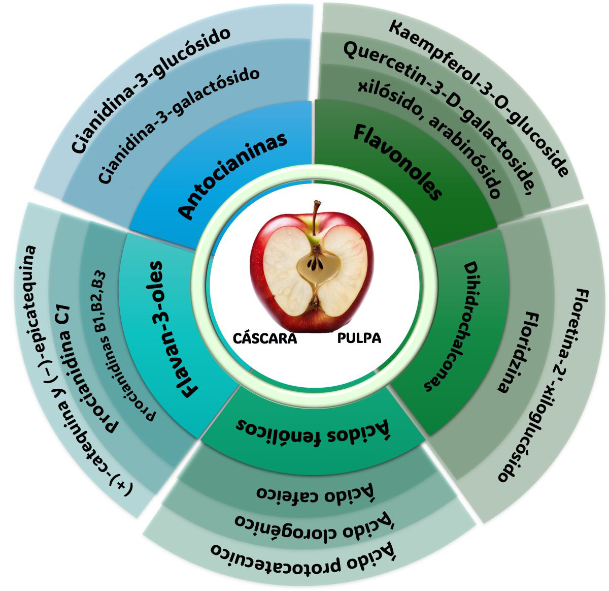 Los estudios metabolómicos realizados a frutos de manzana han permitido la identificación de cinco principales subgrupos de compuestos fenólicos, así como la diversidad química que guarda cada uno de estos grupos incluyendo: ácidos fenólicos, flavonoles, flavan-3-oles, antocianinas y dihidrochalconas (Figura 3). Esta variedad de metabolitos desde el punto de vista medicinal, contribuyen de forma conjunta a la mayoría de los efectos positivos sobre la salud, ayudando a reducir el riesgo de enfermedades cardiovasculares, así como actuando como antioxidantes, anticancerígenos y antiinflamatorios3. En resumen, la manzana es un tesoro de nutrientes y compuestos fenólicos que pueden contribuir significativamente a la prevención de enfermedades y el mantenimiento de buena salud, lo que la hace una excelente opción para consumir a diario.