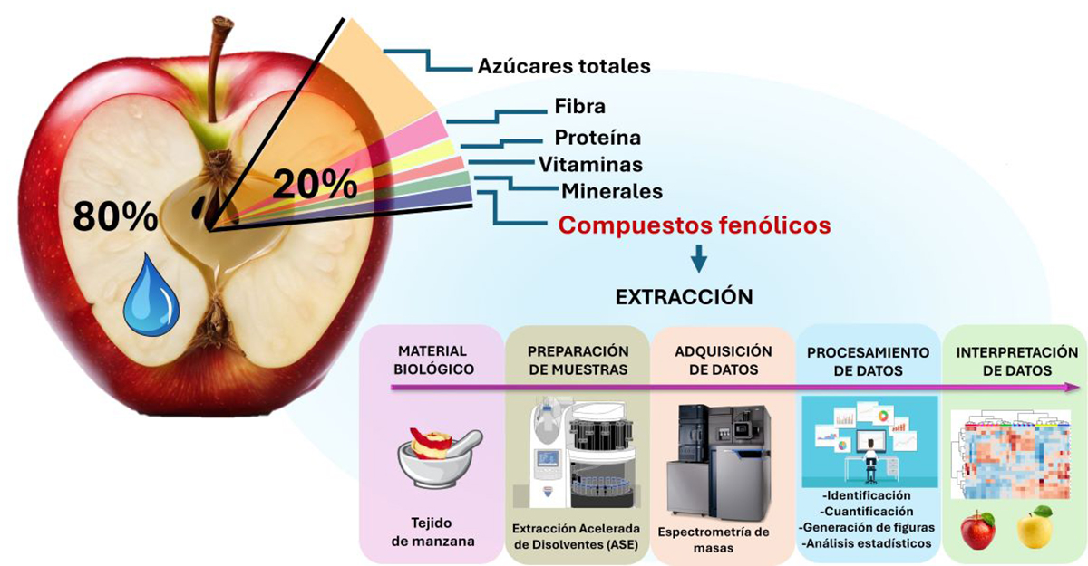 La manzana se compone por 80% de agua, el 20% restante se compone por azúcares, fibra, proteína, vitaminas, minerales y compuestos fenólicos. Para el análisis, la fruta se seca y tritura. La extracción de compuestos químicos se hace manera automática con un sistema de extracción acelerada con disolventes (ASE). La adquisición de datos se realiza mediante espectrometría de masas, para posteriormente realizar la identificación y cuantificación de los metabolitos y análisis estadísticos.