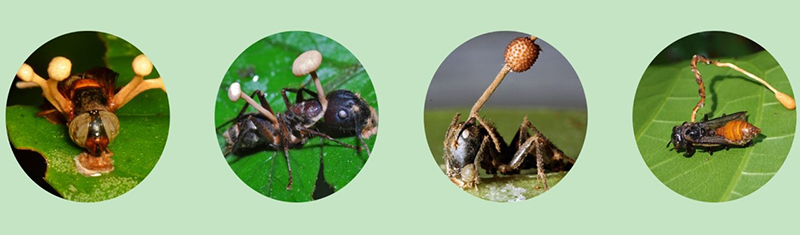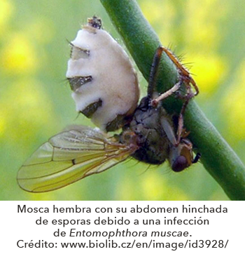 Otro ejemplo asombroso es el hongo Entomophthora muscae que convierte algunas moscas en zombis. El proceso infectivo comienza cuando una espora del hongo penetra al cuerpo del insecto y manipula la mosca para inducirla a moverse hacia las partes altas de las plantas en donde se queda inmóvil y finalmente muere. Después, el hongo produce miles de nuevas esporas que son liberadas para transmitir la enfermedad. De hecho, el hongo fabrica unos microtubos que se llenan con agua a alta presión, y que con su ruptura se genera una expulsión violenta de las esporas a altas velocidades para aumentar la dispersión de las esporas hacia otras moscas. Más impactante aun, es que las moscas hembra infectadas producen compuestos altamente atractivos para los machos, llamados sesquiterpenos. Los machos sanos se ven fuertemente atraídos a copular con los cadáveres de las hembras, donde los machos resultan infectados por el hongo de una manera muy eficiente.