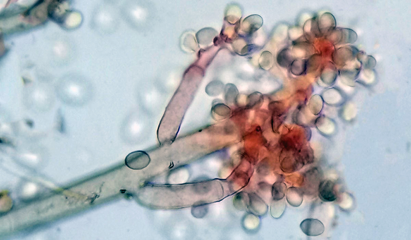 Fotografía 1200x700. Esporas en “racimos” de Botrytis cinerea. Créditos: Eugenia Rivera