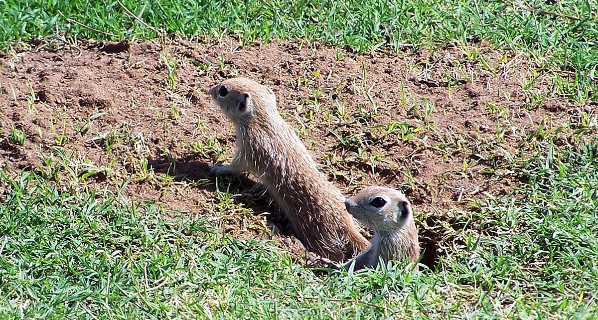 Ardillas de tierra (Xerospermophilus spilosoma) saliendo de su madriguera después de la hibernación