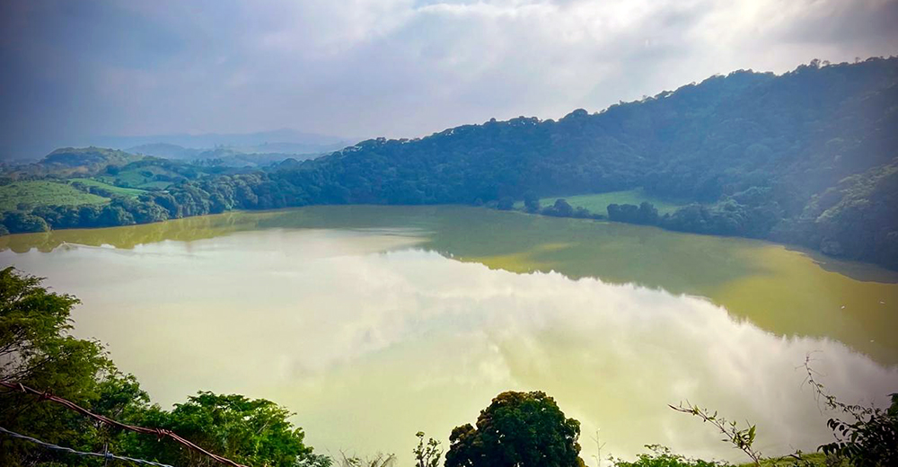 Lago cráter Chalchoapan en los Tuxtlas, Ver., con florecimientos algales. Imagen: Gabriela Vázquez