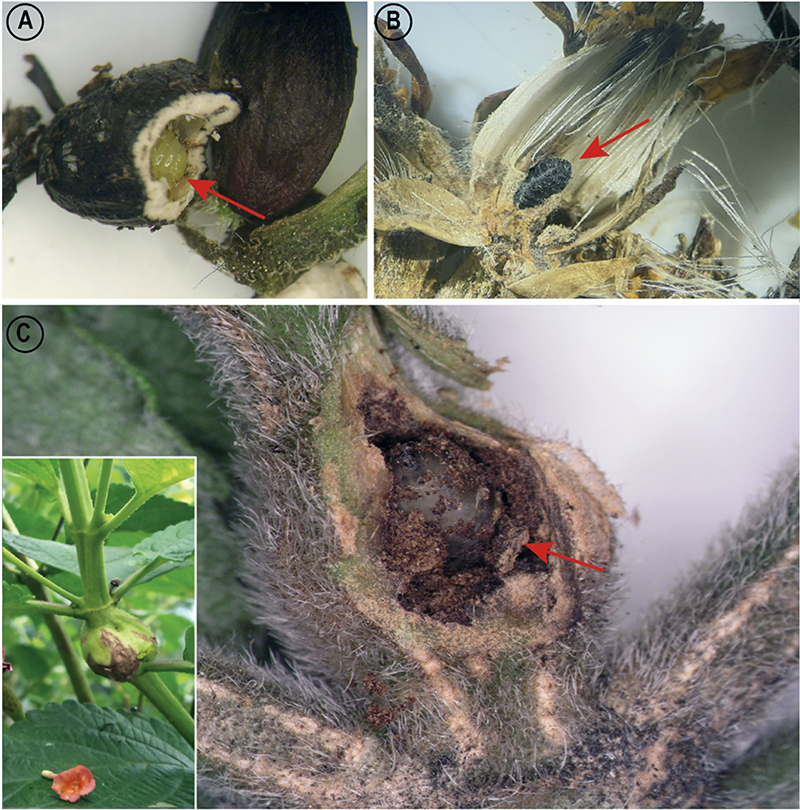 Daños ocasionados por moscas Tephritidae: A) Semilla de Smallanthus maculatus (Asteraceae) depredada por R. spilogaster (foto: Francisco Dzul). B) Pupa en capítulo floral de Heterotheca sp. (Asteraceae) (foto: Ximena Contreras). C) Agallas en tallos producidas por Eutreta xanthochaeta en Lippia myriocephala y Lantana camara (Verbenaceae) (fotos: Vicente Hernández).