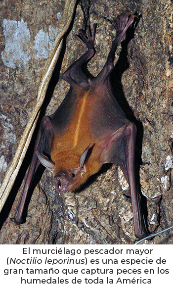 La adaptación a la captura de insectos sobre la superficie del agua parece ser la vía de acceso a la utilización de presas sumergidas de mayor porte. Así, en diversos linajes de Vespertiliónidos, y en los Noctiliónidos, han evolucionado formas de gran tamaño corporal, que capturan peces. A partir de la insectivoría acuática, estas especies han experimentado adaptaciones en el sistema de biosonar, con el cual detectan el movimiento de las ondas en la superficie del agua que provoca la natación de los peces, y adaptaciones morfológicas en las extremidades posteriores, con el agrandamiento de la mano, y alargamiento y aplanamiento lateral de los dedos y las uñas, que les permiten barrer la superficie del agua a modo de rastrillo, y ensartar a los peces con las afiladas garras al momento del impacto. En México viven dos especies de estas espectaculares formas de vida. Uno, el murciélago pescador mayor, Noctilio leporinus, con una envergadura de unos 70 cm, que pesca pequeños peces en los humedales continentales y desembocaduras de ríos de las tierras bajas tropicales de México. El otro, el endémico murciélago pescador mexicano, Myotis vivesi, con una envergadura de unos 50 cm, pesca peces y camarones en las aguas de altamar del Mar de Cortés, a veces a distancias de decenas de kilómetros de las costas e islas rocosas donde se refugia durante el día bajo piedras y en fisuras de roca, siendo la única especie de murciélago viviente que pudiera ser considerado como un mamífero marino.