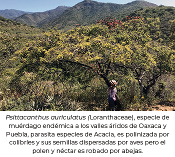 Por lo tanto, es fundamental secuenciar el genoma de un mayor número de especies de plantas parásitas para tener un entendimiento más amplio de la evolución y función del parasitismo en plantas. Actualmente, se realiza investigación para obtener el genoma de un múerdago (Psittacanthus auriculatus), una especie hemiparásita endémica a los valles áridos de Oaxaca y Puebla y cuyo genoma permitirá establecer un marco de referencia para el análisis ecológico y evolutivo del hemiparasitismo, permitiendo abordar temas que actualmente son poco entendidos como son los mecanismos moleculares de la interacción entre el hospedero y la planta parásita.