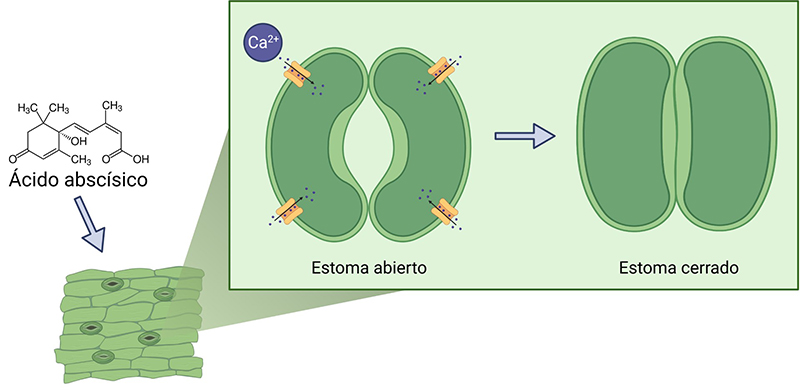 El ácido abscísico (ABA) induce el cierre de estomas. El ABA provoca una entrada masiva de iones de calcio (Ca2+) a las células guarda, lo que ocasiona el cierre de los estomas y previene la pérdida de agua a través de éstos. (Creado con BioRender.com por la MC. Mónica Muñoz-Contreras).