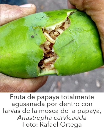 Las Moscas de la Fruta son consideradas una de las plagas más importantes del mundo por los enormes daños directos e indirectos que provocan. Porque no creas que el problema es solo de nosotros en México. ¡Existe en todos los lugares del mundo donde se cultivan frutales! ¡No hay lugar que se salve, excepto lugares como la Antártida, por ahora, ya que el calentamiento global podría cambiar eso! (Qin et al., 2015). Otro factor importante que ha contribuido a la expansión de las especies de Moscas de la Fruta que se convirtieron en plagas, es la destrucción de su hábitat original (bosques y selvas), forzándolas a invadir nuestros huertos para sobrevivir.Antes de adentrarnos en detalles más técnicos, nos gustaría compartir la visión de las tres mujeres coautoras de este artículo de una Mosca de la Fruta. Si como nosotras, quienes nos leen también crecieron y vivieron su infancia y juventud en zonas tropicales del país, rodeadas de árboles frutales, probablemente conocen a estos insectos. Desde Tlacotalpan, pueblo Patrimonio de la Humanidad en Veracruz, hasta Tapachula y Frontera Comalapa en Chiapas, las tres crecimos en el trópico húmedo de México. En nuestros pueblos, tanto en los traspatios de las casas, parques, banquetas de las calles y a lo largo de las carreteras, o en huertos de traspatio o comerciales, crecen árboles de guayaba, mango, naranja, toronja, chicozapote, zapote mamey, jobo (ciruelo tropical), papaya (Figura 2), y muchos más. Recordamos con emoción y nostalgia como solíamos subirnos a los árboles de guayaba para cortar las frutas que colgaban de las ramas en abundancia y llenaban de olor los traspatios de nuestras casas con su delicioso aroma. Sin embargo, pronto experimentábamos una profunda frustración al darles un mordisco o abrirlos, ya que aparecían decenas de gusanos en la pulpa, ¡incluso algunos dentro de nuestras bocas! Y esa historia se repetía cada año, perdiéndose la mayoría de la cosecha familiar por culpa de las Moscas de la Fruta que no se sabía cómo controlar. Es increíble para nosotras (os), autores de este artículo, que después de esas experiencias de nuestras infancias, terminamos como investigadores de estos insectos plaga.