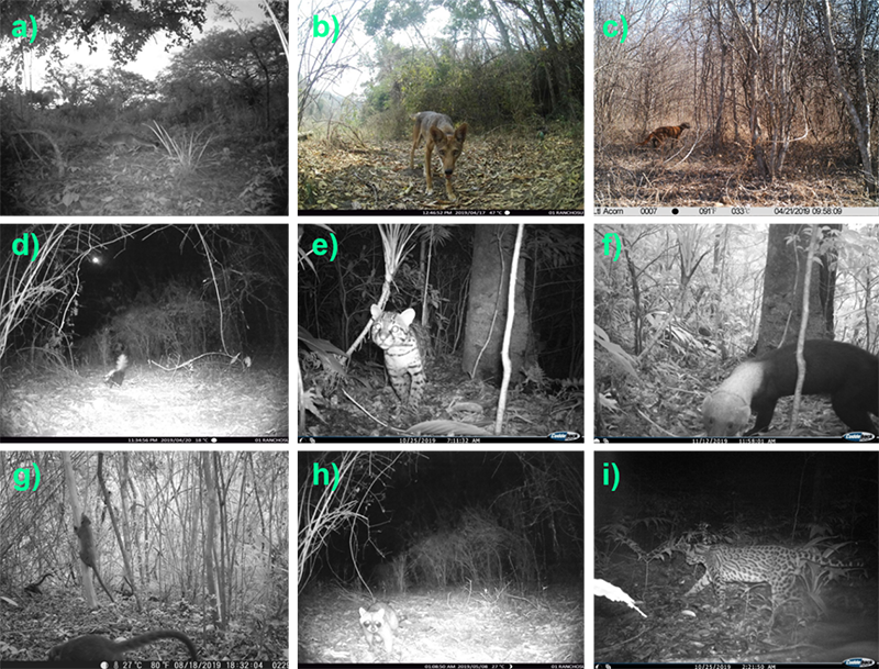 Mamíferos silvestres en UMA de vida libre del centro de Veracruz: a) zorra gris (Urocyon cinereoargenteus), b) coyote (Canis latrans), c) yaguarundí (Herpailurus yagouaroundi), d) zorrillo (Mephitis macroura), e) tigrillo (Leopardus wiedii), f) cabeza de viejo (Eira barbara), g) coatí (Nasua narica), h) mapache (Procyon lotor), i) ocelote (Leopardus pardalis).
