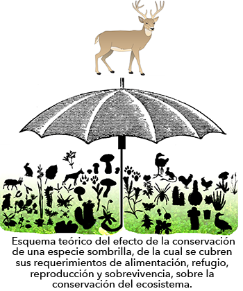 Un ejemplo de estrategia de conservación consiste en conservar y manejar especies protagónicas (sombrilla o bandera) como el venado cola blanca, conservando así el hábitat y múltiples especies que coexisten con el venado e intervienen en la dinámica ecosistémica.