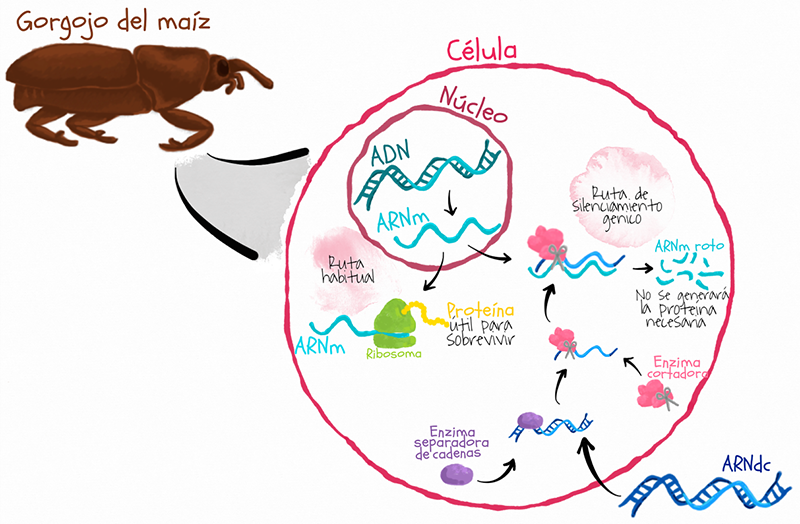 En la última década se desarrolló una estrategia prometedora conocida como Silenciamiento Inducido por RNA Spray. Para entender el fundamento de esta técnica, es importante explicar a grandes rasgos cómo funcionan los organismos. De manera general, toda la información necesaria para que cada especie pueda vivir está depositada en el ADN. A su vez, el ADN está dividido en pequeños segmentos, conocidos como genes, que son instrucciones puntuales para que el individuo pueda llevar a cabo las actividades que necesite para vivir, crecer, desarrollarse, reproducirse o incluso morir. Así, cuando un organismo requiere realizar alguna actividad, se genera una copia del gen encargado de dicha actividad y a esa copia se le llama RNA mensajero, la cual a su vez produce una proteína que finalmente es la que realiza la acción que requiere el organismo. Por otra parte, existen moléculas llamadas ARN interferente de doble cadena (abreviado como ARNdc), capaces de reconocer y ayudar a romper de manera específica la copia del ARN mensajero que se requiera eliminar y por ende impedir que se produzca la proteína a la que da lugar. A este proceso, se le denomina “silenciamiento genético”, pues de alguna manera la instrucción de ese gen en particular se cancela o silencia. Por increíble que parezca, esto ocurre de forma natural en las células de la mayoría de los animales. Justo el Silenciamiento Inducido por RNA Spray utiliza este principio de silenciamiento, sólo que en este caso, lo que se utiliza son ARNdc fabricados artificialmente.