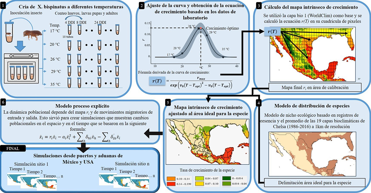 Flujo de trabajo seguido para la construcción de simulaciones. Adaptada de Fadda, L.A., Osorio-Olvera, L., Ibarra-Juárez, L.A., et al. Predicting the dispersal and invasion dynamics of ambrosia beetles through demographic reconstruction and process-explicit modeling. Sci Rep 14, 7561 (2024). https://doi.org/10.1038/s41598-024-57590-1