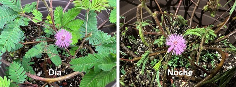 M. pudica también “cierra” sus hojas durante la noche, razón por la cual se le conoce también como dormilona. Esto lo hace a través de un movimiento que es conocido como nictinastia y que obedece a la capacidad que tienen muchas plantas para que sus flores y hojas adopten distintas posiciones en relación con el día y la noche (Figura 2). Este movimiento que obedece al ritmo circadiano dista de aquel previamente descrito que genera un cambio del ángulo de la hoja provocado por la pérdida de turgencia de las células del pulvino, mismo que ocurre en consecuencia de un estímulo (daño o tacto) y que es percibido a distancia y donde la señal rápidamente viaja para generar la respuesta.