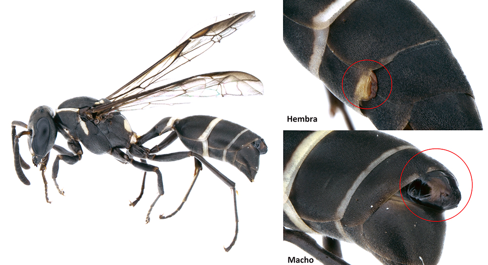 Fig 4. Ejemplares macho y hembra de Brasixenos mesoamericanus dentro de su hospedero (la avispa Polybia plebeja). Ambos sexos pasan su desarrollo larval dentro de su hospedero, pero solo el macho sale volando para reproducirse. El macho de la imagen está dentro de su pupa
