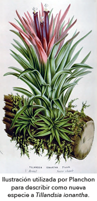 de l'Europe” en el año 1855. La descripción morfológica de Planchon se fundamentó en una ilustración proporcionada por el destacado horticultor belga, el Sr. Louis Van Houtte (Figura 2), reconocido por su influencia en el ámbito hortícola y por ser propietario y editor de la revista antes mencionada y cuya publicación concluyó con su fallecimiento. En su descripción de T. ionantha, Planchon menciona lo siguiente: "Nos vemos obligados a describirla a partir de la figura, por falta de ejemplares... Buscamos en vano en el herbario del Museo de París, así como en los libros que nos han regalado. Es difícil obtener información precisa sobre la horticultura comercial, todo es limitado en el caso de la Tillandsia ionantha, es decir, una planta que ha florecido en los invernaderos del Sr. L. Van Houtte y ha llegado en un cargamento de plantas desde Brasil...”.