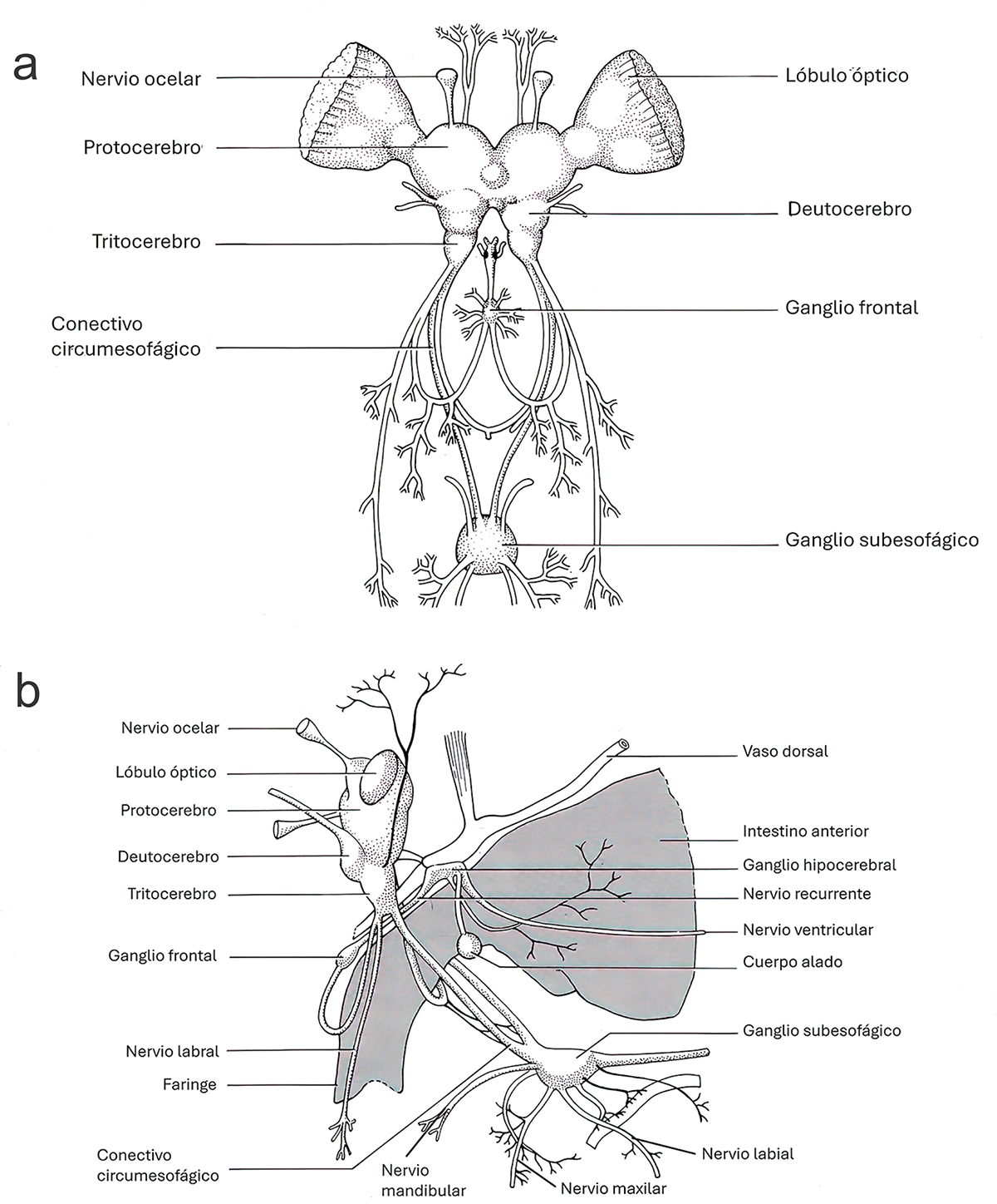 El cerebro de los insectos se compone de tres masas ganglionares principales, a saber (Fig. 2a): el protocerebro, que es el de mayor tamaño y que inerva a los ojos compuestos, por medio de los lóbulos ópticos, y a los ojos simples, también conocidos como ocelos; el deutocerebro, que inerva y controla a las antenas y el tritocerebro, que inerva y controla al labro o labio superior en el aparato bucal, principalmente. El tritocerebro conecta al cerebro con la cadena ventral de ganglios por medio de los nervios que rodean al esófago. De la cadena ventral ganglionar el ganglio subesofágico es el principal y el de mayor tamaño, pues se compone de la fusión de tres pares de ganglios que van a inervar a las partes bucales, tales como las mandíbulas, las maxilas y el labio inferior (Fig. 2b).