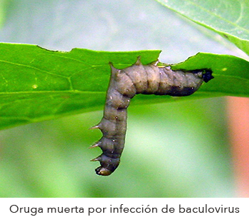 Entonces, ¿cómo se infectan las orugas con los baculovirus? Las orugas se infectan después de consumir hojas contaminadas con los cuerpos de oclusión. El proceso es el siguiente: los virus infectan el intestino de la oruga, luego se dispersan y empiezan a replicarse en todo el cuerpo de la oruga. Después de unos días, todos los tejidos del insecto se encuentran repletos de partículas de virus. Es en esta etapa de la infección cuando comienza la producción de una enzima viral que convierte al insecto en un saco de líquido lleno de millones de partículas de virus. Finalmente, la oruga muere de la infección y en consecuencia el líquido se libera y contamina las hojas de la planta. Esta contaminación de las hojas permite después la transmisión del virus a otras orugas.