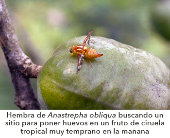 Investigaciones en su medio natural, nos han mostrado que las hembras de esta especie de mosca de la fruta son totalmente diurnas y algunos de sus comportamientos más notorios como el sexual, el de alimentación, o el de oviposición (consistente en inyectar huevos en un fruto) son influenciados por la luz solar y las temperaturas que ésta genera sobre la superficie de frutos y hojas. Por ejemplo, en un estudio a inicio de los 90´s (1), se descubrió que tanto hembras como machos de la Mosca del Mango se movían a lo largo del día entre árboles de mango (con mucho follaje que generaba sombra en la parte interna y un microclima fresco) y de ciruelo tropical (sin follaje y por lo mismo con un microclima muy caliente), y que ese patrón estaba íntimamente ligado a la incidencia de luz y resultante temperatura. Las hembras “dormían” en los árboles de mango y se desplazaban muy temprano en la mañana (pico de actividad a las 07:00 horas) o por la tarde (17:00-18:00 horas) a los árboles de ciruelo para poner sus huevos (Figura 2). Lo anterior, porque a medio día la temperatura en los árboles de ciruelo en la región de estudio podía superar los 40 oC como resultado de la elevada irradiación solar sobre los frutos en árboles desprovistos de follaje (los ciruelos cuando cargan frutos no tienen hojas).