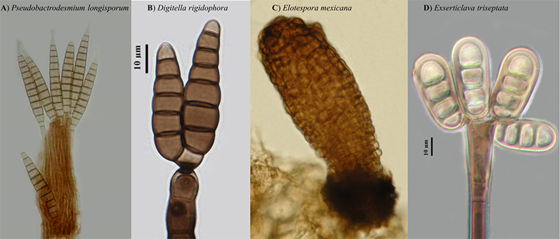 A) Pseudobactrodesmium longisporum, B) Digitella rigidophora, C) Elotespora mexicana, D) Exserticlava triseptata.