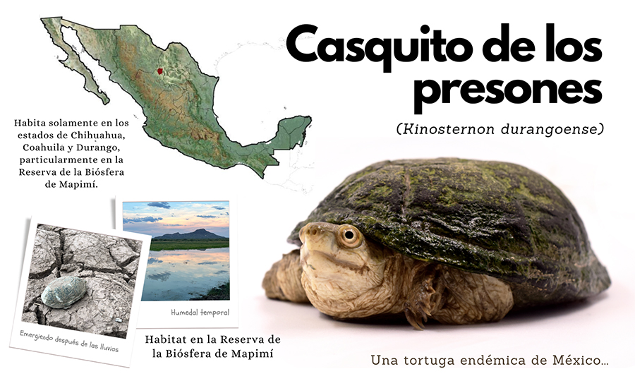 La Reserva de la Biósfera de Mapimí se ubica en los vértices de los estados de Chihuahua, Coahuila y Durango. Fue creada en 1979, para resguardar los ecosistemas representativos del Desierto Chihuahuense y para proteger a la tortuga del bolsón (Gopherus flavomarginatus), la tortuga terrestre más grande de Norteamérica; si bien esta especie se ha convertido en una especie emblemática, sombrilla para proteger a muchísimas especies de flora y fauna de la región, esta no es la única tortuga que habita en estas resecas tierras, la reserva de Mapimí, con sus humedales temporales y en particular sus charcas y bordos implementados por los ganaderos (conocidos localmente como presones), son habitadas también por la tortuga de lodo de Durango o Casquito de los presones (Kinosternon durangoense), una especie mucho más pequeña que la gran tortuga terrestre del Bolsón de Mapimí. Con sus no más de 16 cm de longitud, esta tortuga depende directamente de cuerpos de agua para dispersarse y sobrevivir ya que solamente habita en esta región del mundo (Figura 1).