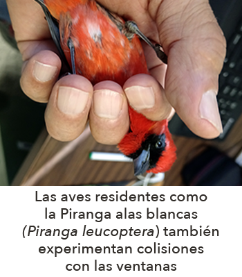 Las aves residentes pueden chocar con ventanas debido a la familiaridad con su entorno, lo que las hace menos cautelosas ante los obstáculos. Por otro lado, las aves migratorias pueden chocar con ventanas debido a la fatiga del viaje, la desorientación causada por las luces artificiales de las ciudades o la falta de familiaridad con el área. Es así como las colisiones con ventanas afectan a una amplia variedad y tamaño de aves, tanto locales como migratorias, y para lo cual se deben implementar medidas de prevención para protegerlas. Algunas aves colisionadas pueden tener suerte y algunas de ellas se pueden recuperar, pero en la mayoría de los casos, sucumben ante el fuerte impacto con los vidrios de las ventanas.