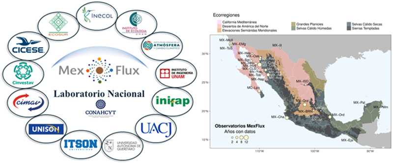 MexFlux es la red mexicana de monitoreo del intercambio de agua, energía y gases de efecto invernadero entre los ecosistemas y la atmósfera. Establecida en 2011, ha sido recientemente reconocida como Laboratorio Nacional Conahcyt (diciembre de 2023). Esta distinción consolida a MexFlux como un destacado equipo de trabajo compuesto por más de 40 investigadores de 13 instituciones académicas a lo largo del país, de las cuales el INECOL funge actualmente como representante (Figura 1). Esta articulación de personas e infraestructura es posible gracias a casi dos décadas de trabajo colaborativo.