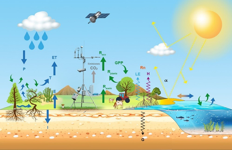 Fig 2. Intercambios de agua (flechas azules), carbono (flechas verdes y gris) y calor (flechas amarillas y de otros colores) entre la atmósfera y los ecosistemas. Créditos: Tarín-Terrazas et al. (2022)