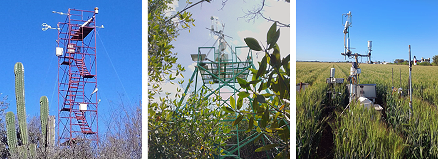 Fig 3. Torres de flujos ecosistema-atmósfera en los observatorios del LNC-MexFlux: bosque tropical seco en Sonora (izquierda), manglar en Puerto Morelos (centro), trigo en el Valle del Yaqui (derecha). Créditos: LNC-MexFlux.
