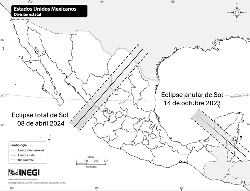 Trayectoria de los eclipses solares en México 2023 y 2024. Eclipse anular de sol ocurrido el 14 de octubre de 2023 en la Península de Yucatán. Eclipse total de sol que ocurrirá el 08 de abril de 2024 en zona norte del país. Créditos: Mapa del INEGI de la República Mexicana, con el trazo de los eclipses 2023 – 2024 realizados por José G. García Franco