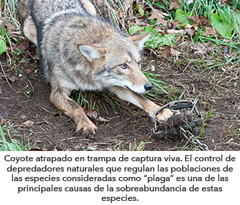 La ausencia de depredadores -los cuales han desaparecido de los ecosistemas por cacería ilegal o sobreexplotación-, así como la introducción de especies exóticas -especies que no se encuentran de forma natural en los ecosistemas- son algunas de las principales causas. En áreas cinegéticas o forestales, las situaciones de sobreabundancia se deben a la alimentación suplementaria, al manejo intensivo de las poblaciones y a las malas prácticas silvícolas. Mientras que, en el contexto agrícola y ganadero, la sobreabundancia de estas especies silvestres se asocia a cambios en los usos del suelo y al incremento de ciertos cultivos que resultan especialmente atractivos. Así, en muchos casos, incluso, no se trata de una sobreabundancia, sino de unos cuantos individuos atraídos constantemente hacia los campos de cultivo como si se tratase de un cebo o un señuelo. Asimismo, el uso de venenos por parte de los agricultores, merma o extermina poblaciones de especies clave en los ecosistemas, como, por ejemplo, depredadores naturales que regulan las poblaciones de las especies consideradas como “plaga”. Por otra parte, en las ciudades, la disponibilidad de alimento -contenedores de basura, alimento para mascotas, etc.- es uno de los factores que han provocado un aumento de la abundancia de algunas especies silvestres, favoreciendo en algunos casos un proceso de semi-domesticación, mismo que, afecta directamente la salud del sistema causando daños económicos, ambientales y epidemiológicos.